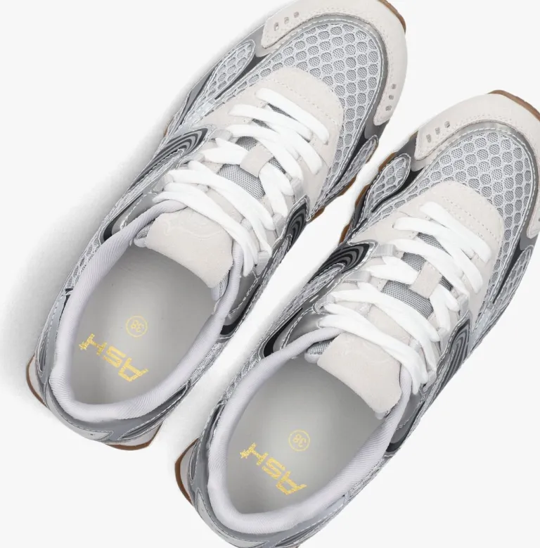Voeg een vleugje glamour toe aan je lente- en zomergarderobe met de zilveren KABUKI sneakers van ASH. Deze lage sneakers met ronde neus zijn perfect voor een dagje shoppen in de stad of een ontspannen wandeling langs de boulevard. De buitenkant van mesh straalt stijl uit, terwijl de leren en textiele binnenkant zorgt voor comfort bij elke stap. De rubberen zool biedt de juiste grip, ideaal voor een actieve dag. Combineer ze met een luchtige zomerjurk of een trendy jeansshort voor een moeiteloze look. De vetersluiting geeft een klassieke touch aan deze moderne must-have voor dames.