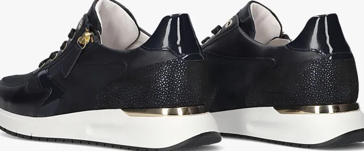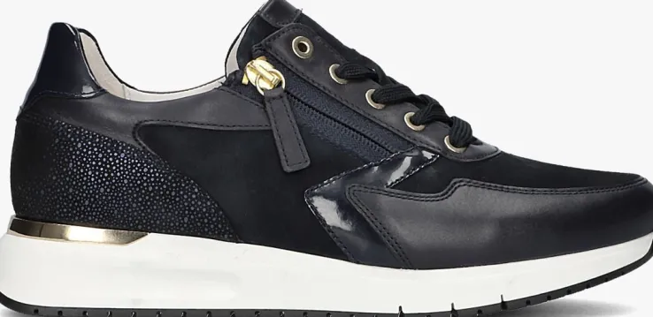 Deze donkerblauwe lage platformsneaker 448komt uit de Comfort collectie van het merk Gabor. Comfort schoenen hebben meer volume bij de tenen en bij de bal van de voet en bieden voor iedere voet de noodzakelijke ruimte. Dit model is uitgevoerd in zwartgladleer met een laag van donkerblauw suède voor een unieke look. De binnenvoering is een combinatie van leer en textiel en het leren voetbed is uitneembaar. De gestreepte platformzool is van lichtgewicht microrubber en de zoolrand is afgewerkt met een goudkleurige hielstabilisator. Dit model heeft een H-wijdte en met de handige ritssluiting naast de veterklep trek je ‘m gemakkelijk aan en uit!