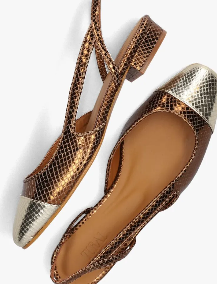 Slingback voor dames van het merk Toral. Deze schoen met een champagne kleurige ronde neus is uitgevoerd in brons. De binnenkant is uitgevoerd in leer. De leren loopzool heeft een medium profiel voor stevige grip. De kleine hak meet circa 2 cm.