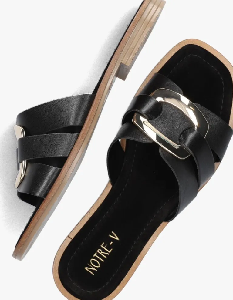 Stap in stijl met deze zwarte leren slippers van NOTRE-V. Deze zwarte leren slippers hebben drie bandjes van zwart leer met het midden een goudkleurige element. Met de zachte leren binnenvoering, comfortabele zool en het elegante design zijn deze slippers perfect voor een dagje strand of een zomerse wandeling. Combineer ze met een luchtige zomerjurk of een trendy jumpsuit voor een casual-chique look. Met de 22718 slippers van NOTRE-V ben je klaar voor elke zonnige dag!