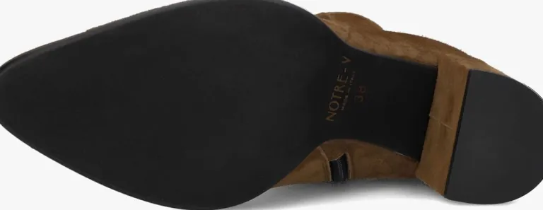 De schoenen van het merk NOTRE-V zijn tijdloos, maar met een knipoog naar de laatste trends. Deze fijne enkellaars 67034 is daar een mooi voorbeeld van. Dit model is uitgevoerd in cognackleurig suède en heeft subtiele details die dit rustige design trendy maken, zoals de spitse neus, de beklede blokhak en de goudkleurige ritshanger met merkreliëf. De blokhak is 8 centimeter hoog en de schachthoogte is 13centimeter, gemeten bij maat 38. Het binnenwerk is gemaakt van leatherlook ik combinatie met een vast, leer voetbed. De rubberen loopzool heeft een gripvast profiel dat zorgt voor veel stabiliteit bij iedere stap. Een trendy schoen die je makkelijk combineert!