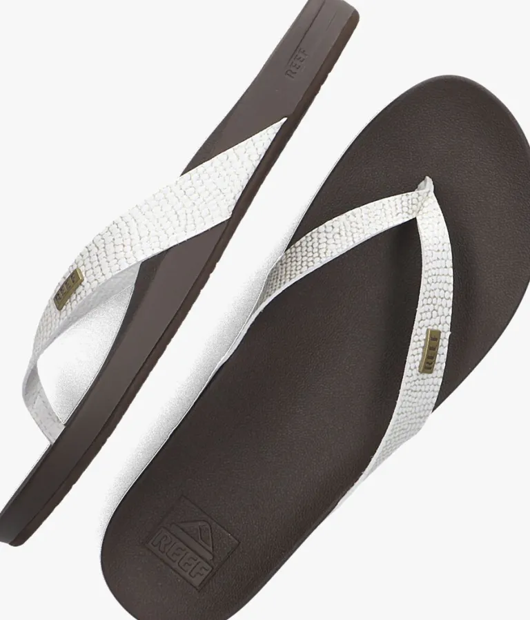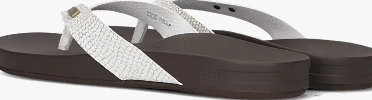 Uit de collectie van het merk Reef is deze uitzonderlijk comfortabele slipper CUSHION COURT. Dit witte model heeft bandjes van leatherlook met reprielenprint en goudkleurige glitters. Het schokabsorberend, gekussend bounce-voetbedmet anatomische vormgeving zorgt voor optimaal comfort tijdens ieder avontuur.De gevormde, rubberen buitenzool is flexibel en biedt veel stabiliteit.De ideale slipper voor ieder avontuur!