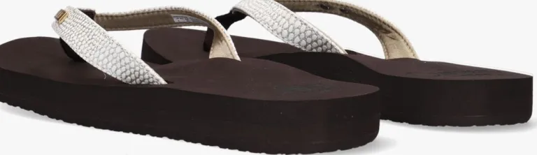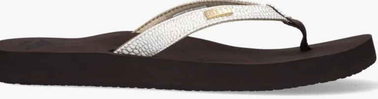 Uit de collectie van het merk Reef is deze zomerse teenslipper STAR CUSHION SASSY. Dit witte model heeft lederlook bandjes met een subtiele reptielenprint en een metallic zilverenfinish. Hetzachte voetbed is van EVA-schuimrubber en heeft een anatomische ondersteuning voor optimaal comfort. De gripvaste rubberen zool loopt naar achteren tot op tot 2 cm. De ideale slipper voor ieder avontuur!