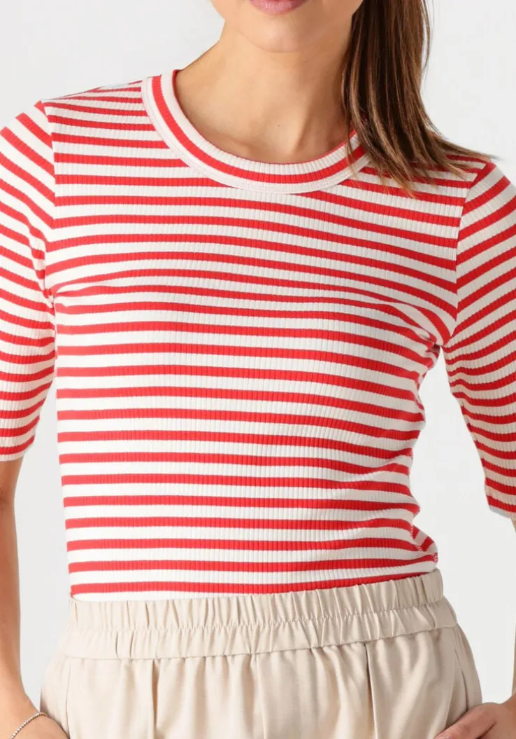 Voeg een vleugje elegantie toe aan je garderobe met de DAGNAIW STRIPED T-SHIRT van INWEAR. Deze rood gestreepte top, gemaakt van zacht katoen, biedt ultiem comfort en stijl. Perfect voor een dagje shoppen of een ontspannen lunch met vriendinnen. Combineer met een strakke jeans voor een casual look of draag onder een blazer voor een chique touch. De subtiele strepen geven een speelse twist aan je outfit. Een veelzijdige must-have voor elke dame die houdt van tijdloze mode.