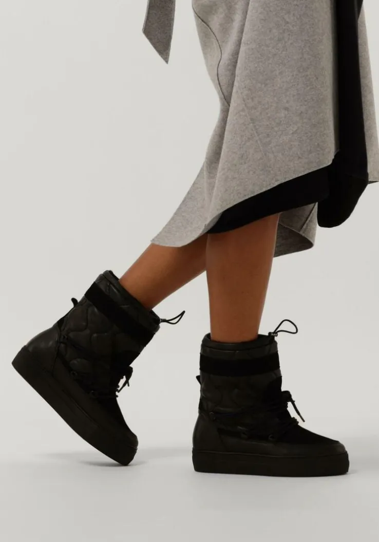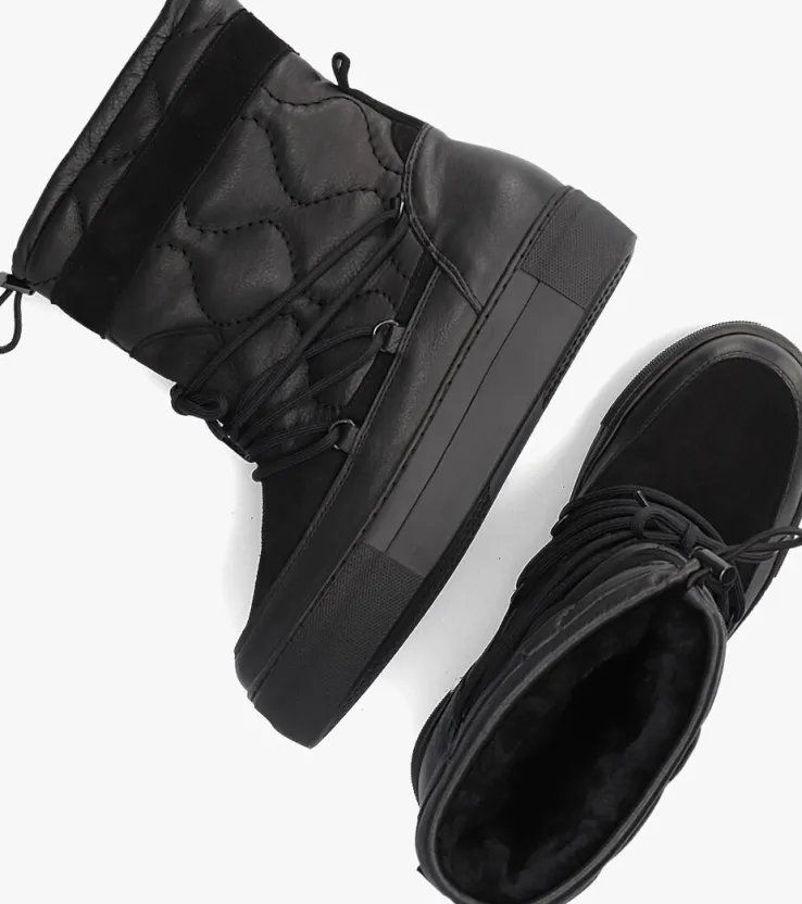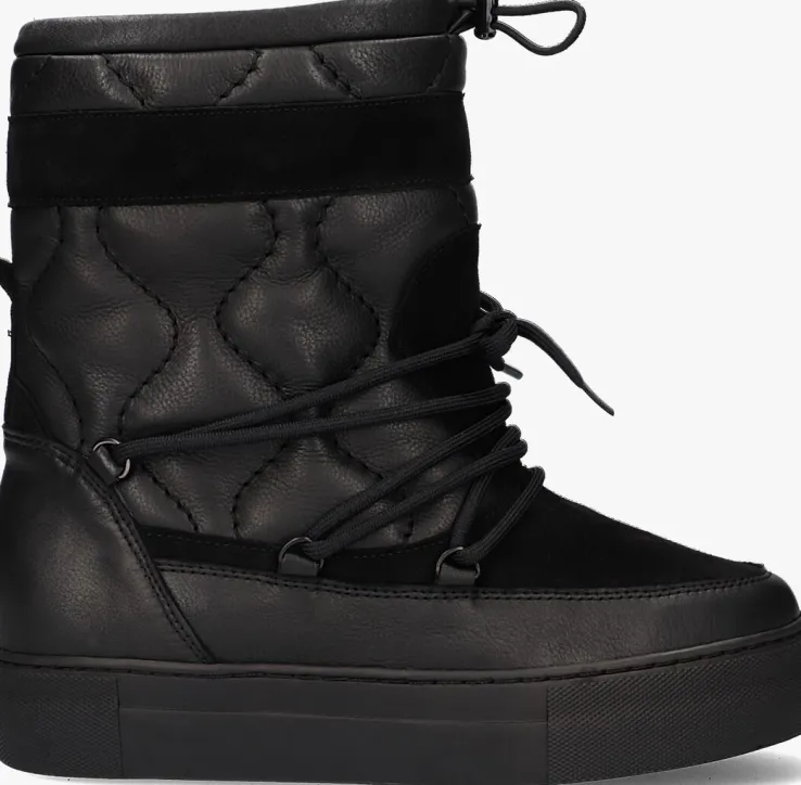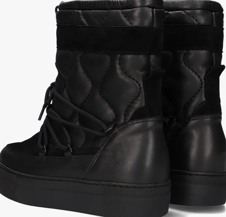 Dit toffe model is een ware eyecatcher! Deze zwarte snowboot 74654 is van het vooruitstrevende merk RED-REG en heeft een bovenwerk van leer met panelen van zacht suède. De boot heeft een een doorgestikte schacht met een golvend profiel en een hoogte van 19 centimeter met een verstevigende hielcap van leer en een suède aantreklus. De vetersluiting over de wreef geeft hem een extra stoere touch en met het trekkoordje boven aan de schacht draag je hem gemakkelijk iets strakker of losser, maar net wat jij fijn vind. Het binnenwerk is gevoerd met heerlijk, warm en zacht wol in combinatie met een uitneembaar voetbed van leer, zodat je ook tijdens koude winterdagen lekkere warme voeten behoudt. De rubberen plateauzool met reliëf rondom de neus en hiel is 3,5 centimeter hoog, waardoor hij zorgt voor wat extra lengte.Het golvende profiel geeft een goede grip en stabiliteit. Combineer ‘m bij je favoriete outfit en steel de show!