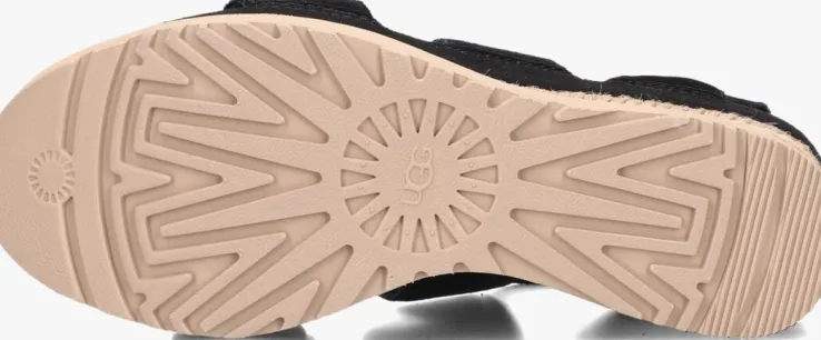 Sandaal met sleehak voor dames van het merk UGG. Deze sandaal met open neus is uitgevoerd in zwart suède. Over de voorvoet loopt een brede band. Een bandje rondom de enkel en een stevig hielpad dragen bij aan het loopcomfort. De sleehak met raffia meet circa 4 cm en de rubberen zool heeft een medium profiel voor stevige grip.