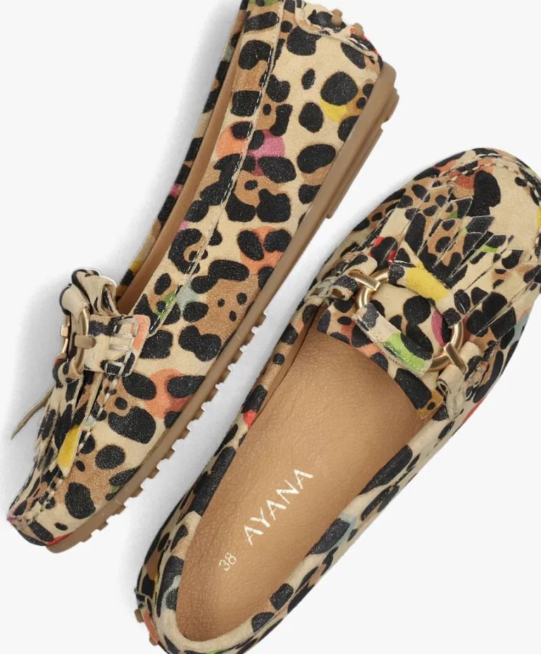 Stap in stijl met deze prachtige suède mocassins van AYANA. De kleurrijke details maken deze schoenen perfect voor elke gelegenheid. De mocassins is gemaakt van zacht suède met leopard print en goudkleurige buggle op de wreef. De hiel is extra beschermd door de rubberen stoot noppen op de achterzijde. De binnenkant is van leer en het voetbed is uitneembaar. De schoen heeft een ultiem comfort door de rubberen zool met noppen profiel, perfect voor dagelijks gebruik. Laat je creativiteit de vrije loop en creëer jouw eigen unieke stijl met deze eyecatchers aan je voeten. Laat jezelf stralen en voeg deze must-have schoenen toe aan je collectie.