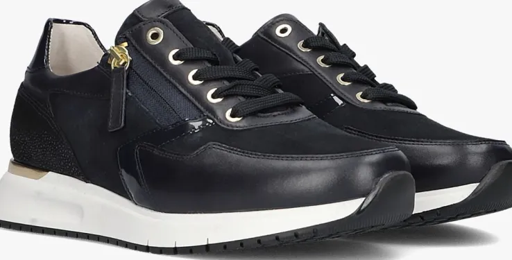Deze donkerblauwe lage platformsneaker 448komt uit de Comfort collectie van het merk Gabor. Comfort schoenen hebben meer volume bij de tenen en bij de bal van de voet en bieden voor iedere voet de noodzakelijke ruimte. Dit model is uitgevoerd in zwartgladleer met een laag van donkerblauw suède voor een unieke look. De binnenvoering is een combinatie van leer en textiel en het leren voetbed is uitneembaar. De gestreepte platformzool is van lichtgewicht microrubber en de zoolrand is afgewerkt met een goudkleurige hielstabilisator. Dit model heeft een H-wijdte en met de handige ritssluiting naast de veterklep trek je ‘m gemakkelijk aan en uit!