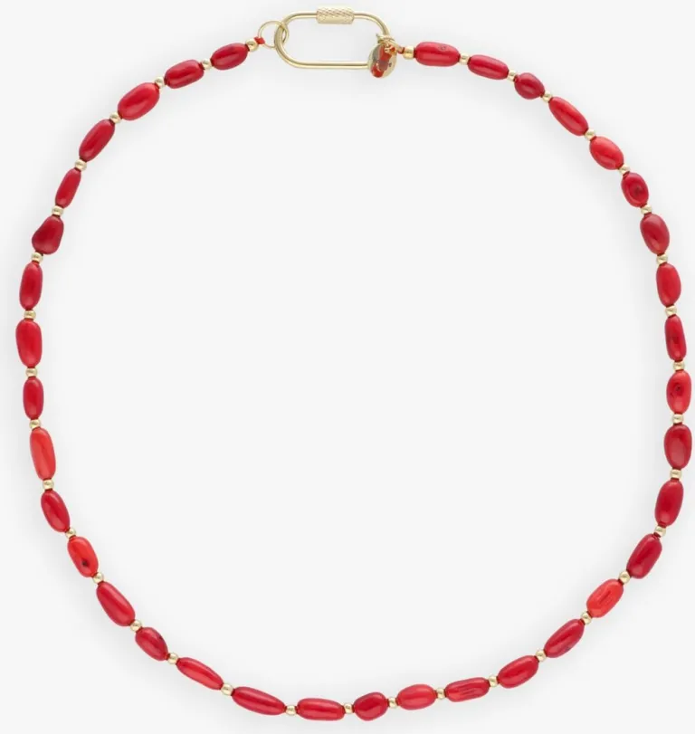 Dit sieraad is gemaakt van koraal en 18K vergulde sluiting.