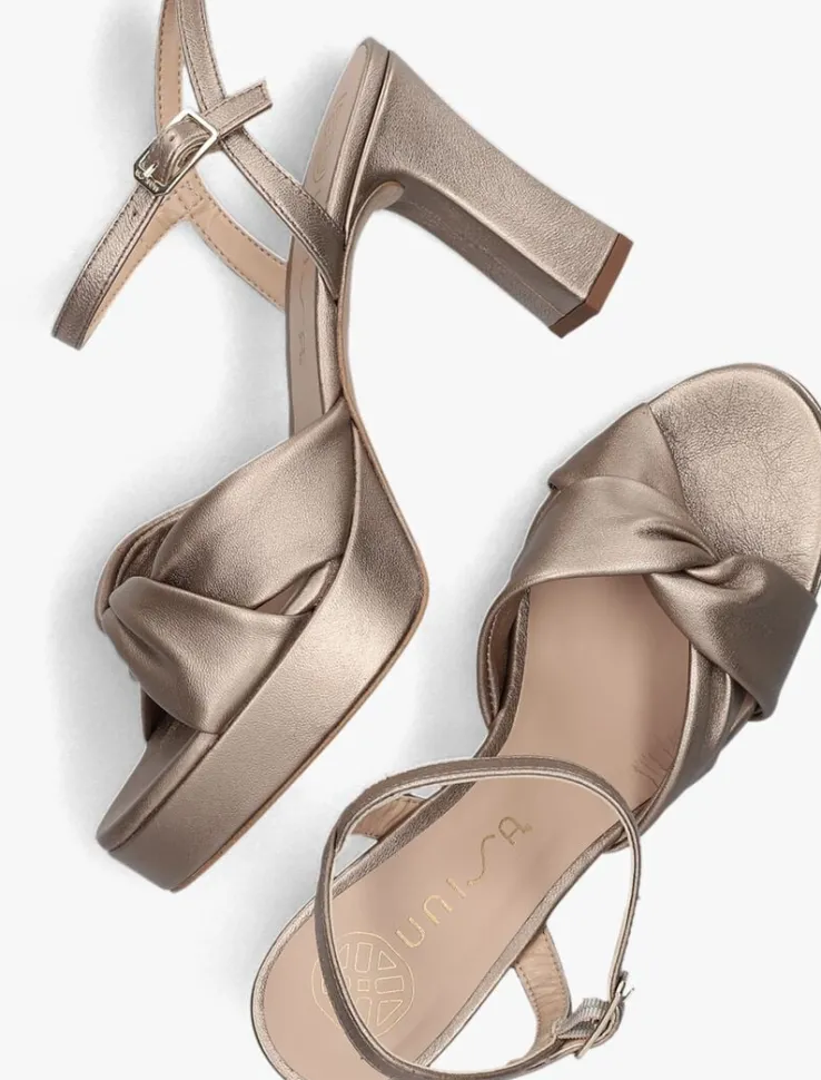 Ga voor een elegante, retro look met deze bronskleurige sandaal ONOA met plateau, blokhak en ronde neus van het merk UNISA! Dit unieke model van leer heeft twee brede banden met een geknoopt detail op de voorvoet en een sierlijk enkelbandje met handige, goudkleurige gespsluiting. Alle bandjes zijn gevoerd met soepel leer en het voetbed is van leer met een toplaag en een licht dempende werking voor een comfortabel gevoel. Mooi detail is dat het plateau en de blokhak bekleed zijn met hetzelfde leer, waardoor de sandaal een sophisticated uitstraling heeft onder jouw outfit. De rubberen loopzool en haktip zorgen voor een goede grip. Het plateau onder de voorvoet is 3 centimeter dik en de hak heeft een hoogte van 10 centimeter. Combineer ‘m met jouw mooiste outfit en steel de show!