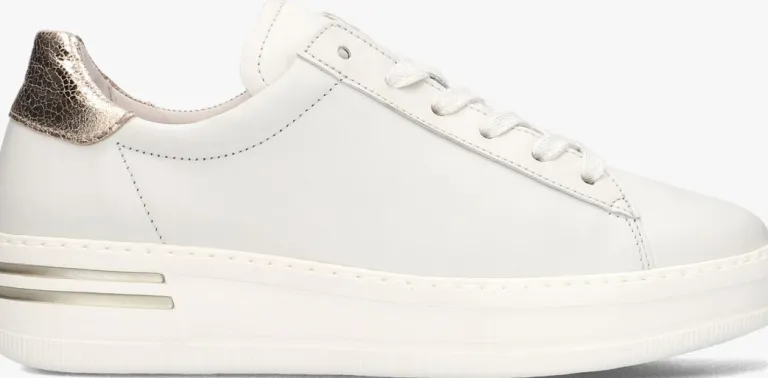 Stap in stijl met deze witte lage sneakers van GABOR. Het bovenwerk bestaat uit leer en heeft goudkleurige accenten. De sneakers passen perfect bij een casual outfit voor een dagje shoppen of een gezellige lunch met vriendinnen. Het leer aan de binnen- en buitenkant zorgt voor een luxe uitstraling en de rubberen zool biedt grip en ondersteuning. Met deze sneakers aan je voeten ben je klaar voor elke gelegenheid!