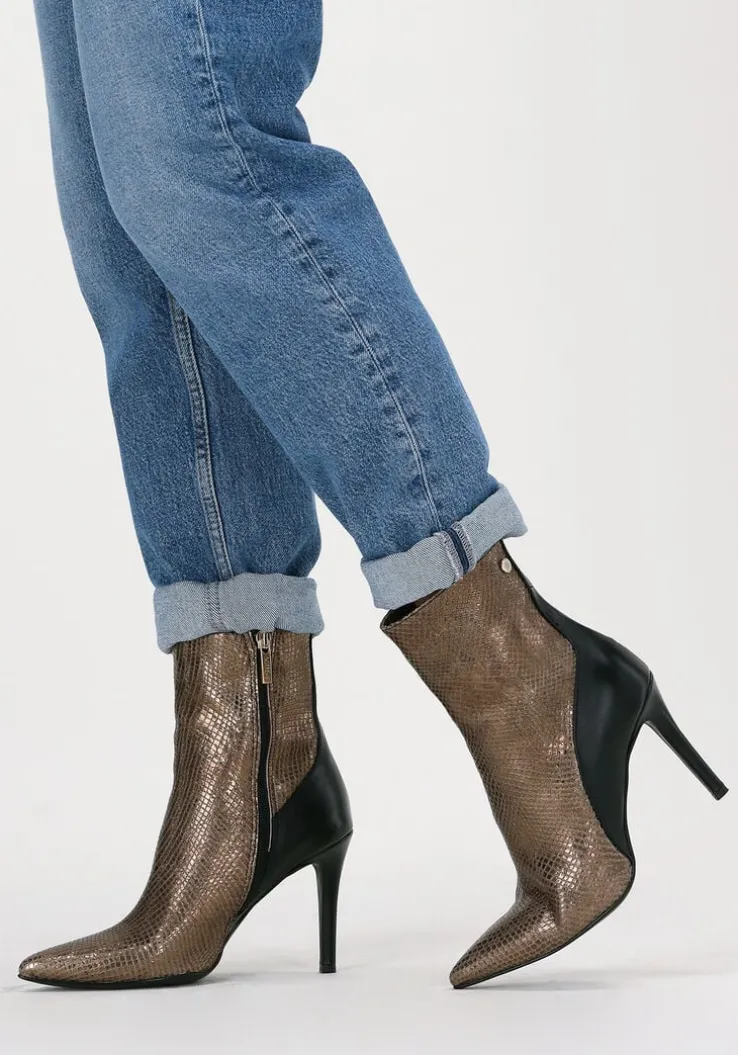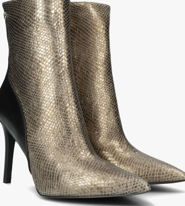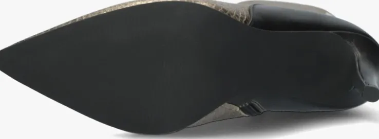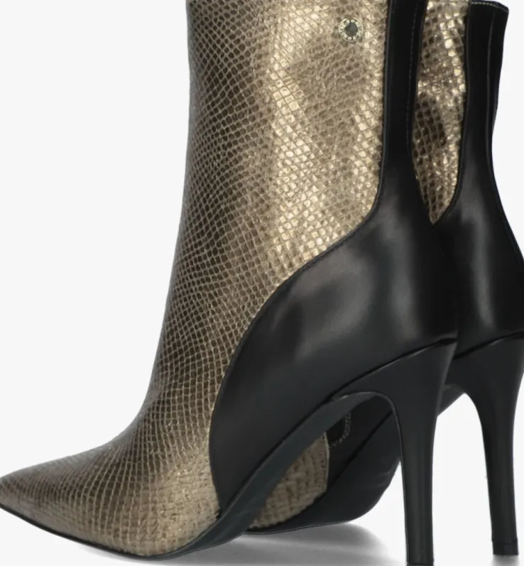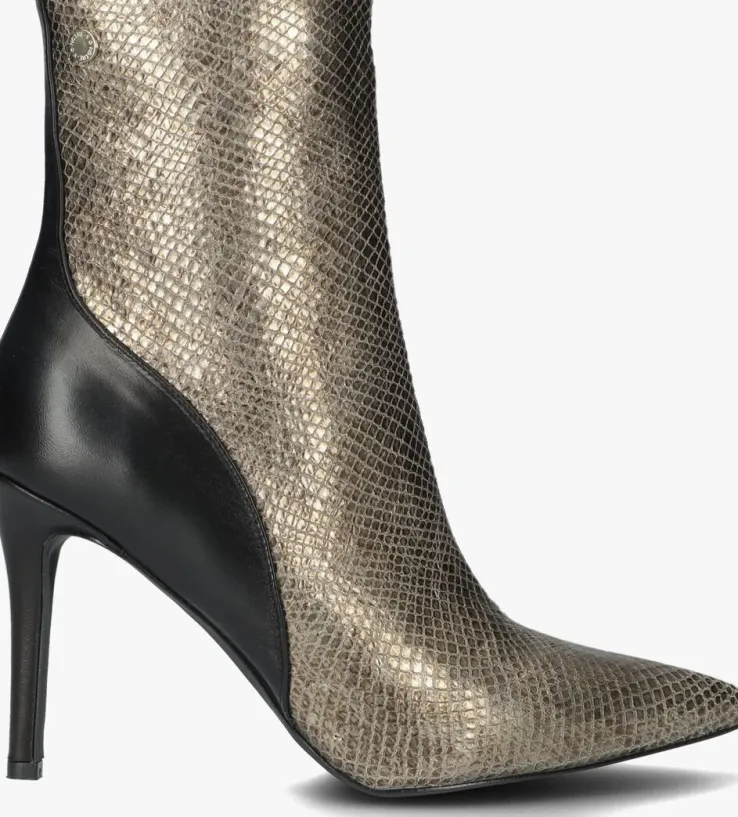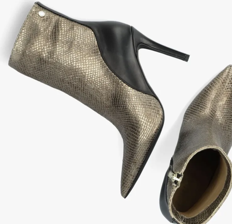 De elegante Italiaanse ontwerpen van het merk NOTRE-V zijn er voor de verfijnde vrouw die er graag effortless chic uit wil zien. De producten zijn gemaakt van luxe materialen met subtiele accenten en een knipoog naar de laatste trends.Dit enkellaarsje 17535 kenmerkt zich door het opvallende bovenwerk van goudkleurig leer met reptielenprint, een spitse neus en bijpassende hoge naaldhak van ruim 9 centimeter hoog die bekleed is met zwart leer net zoals het achterpand en de hielcap.De ritssluiting aan de binnenzijde van de laars zorgt voor een gemakkelijke instap. Het binnenwerk van leer met het vaste voetbed voelt comfortabelaan. De kuitwijdte bovenaan gemeten is 27 centimeter. De schacht heeft een hoogte van 16 centimeter, gemeten bij maat 37 en de loopzool is uitgevoerd in kunststof. Onder welk outfit laat jij dit laarsje mooi uitkomen?