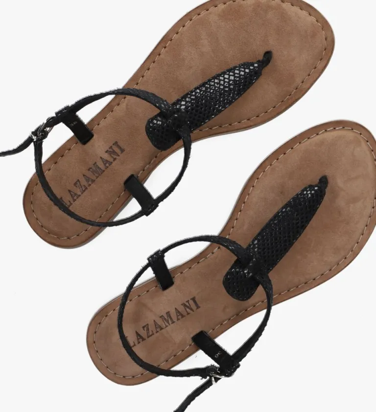 Het merk LAZAMANI ontwerpt al sinds 1988 met veel vakmanschap en creativiteit slippers en sandalen. De perfecte mix is hét recept voor een trendy sandaal waarbij comfort niet onder doet. Deze te gekke zwarte sandaaltjes75.611van LAZAMANIzijn een key-item in je zomergarderobe! Dit model met teenstuk is uitgevoerd in zwart suèdelook met een trendy glanzend reptielstructuuren heeft een smal enkelbandje met zilverkleurig gespje.De voering is van leer, hetheerlijk zachte voetbed isvan suède en de supersoepele zool met klein hakje is van rubber. Laat hetzonnetje maar schijnen!