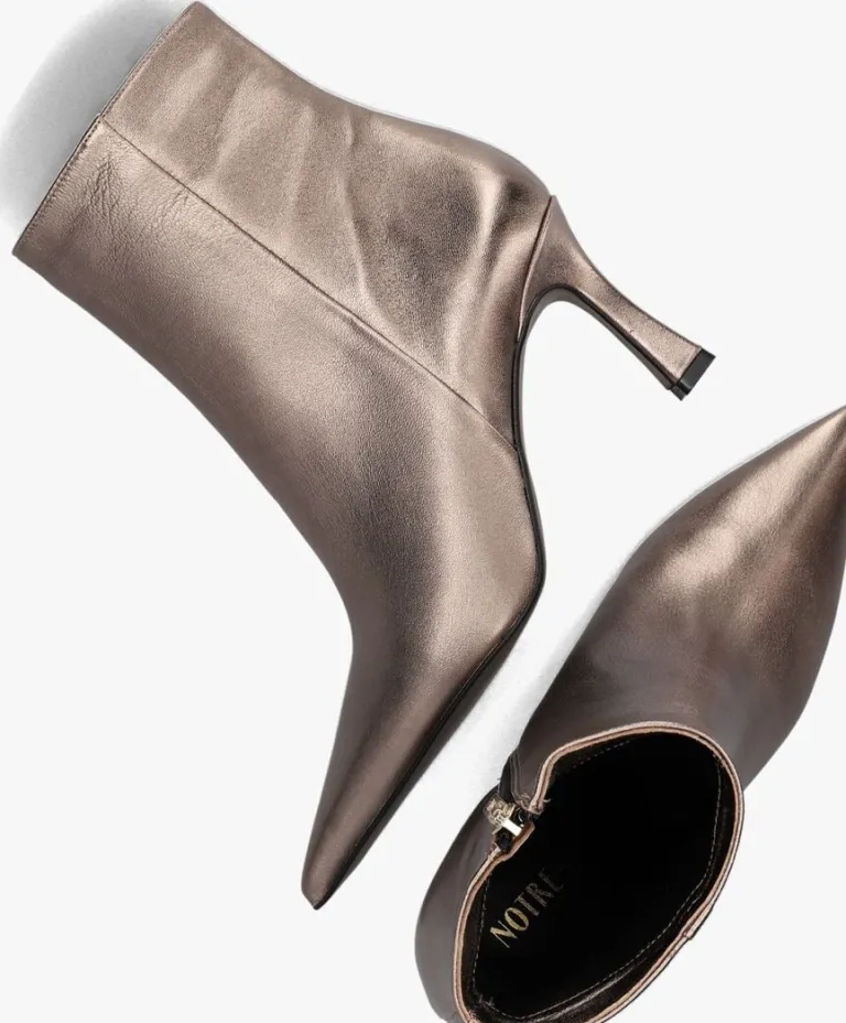 Ga voor een chique look met deze enkellaars 19536 van het toffe merkNOTRE-V!Dit modelheeft een bovenwerk van hoogwaardig leer in een mooie, bronzen kleur. De laars heefteen rechte schacht met een handige ritssluiting aan de binnenzijde om ‘m gemakkelijk aan en uit te trekken. Opvallend detail is de naar binnen gestikte naad aan de schacht en de goudkleurige ritshanger met merkreliëf. Verder heeft dit item een trendy puntige neus met een kittenheel van zo’n 8 centimeter hoog. Het binnenwerk bestaat uit zacht leer in combinatie met leatherlook dat comfortabel aanvoelt aan je voeten en de schoen heeft een vast voetbed. De kunststof loopzool geeft de laars een mooi afgewerkt geheel en met het fijne lijntjesprofiel heb je een goede grip. Deschacht is 15 centimeter hoog, gemeten bij maat 38. Draag de schoenen elegant onder eenjurkje of stoer onder een jeans!