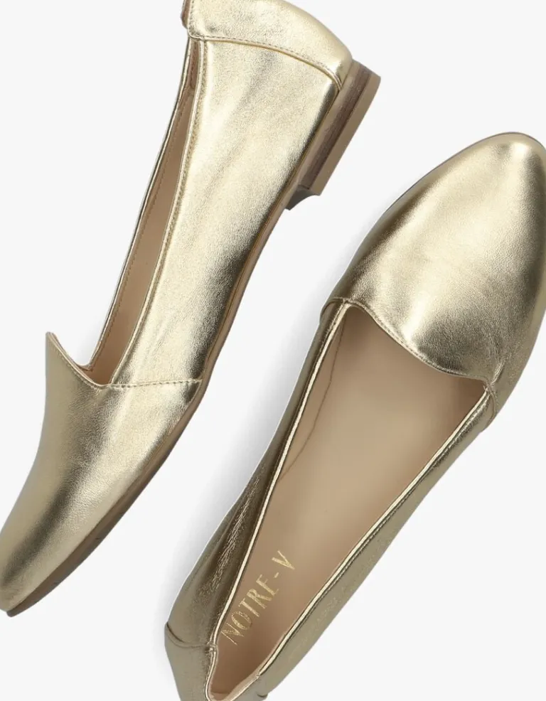 De elegante Italiaanse ontwerpen van het merk NOTRE-V zijn er voor de verfijnde vrouw die er graag effortless chic uit wil zien. De producten zijn gemaakt van luxe materialen met subtiele accenten en een knipoog naar de laatste trends. Met deze klassieke loafer 43576 maak jij je outfit af en zorg je voor een elegante touch. De buitenkant is uitgevoerd in metallic goudkleurig leeren heeft een mooi en eenvoudig silhouet. De voering is gemaakt van leer met een vast voetbed en een licht opgevuld vast voetbed. Het kleine gelaagde hakje vanruim 1centimeter dik heeft net als de loopzool een rubberen afwerkingen is voorzien van een fijn profiel.