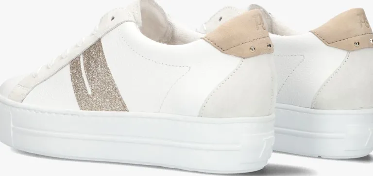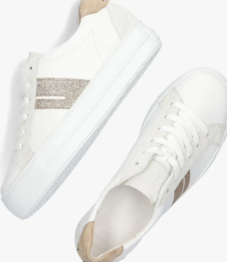 Stap in stijl met deze witte lage sneakers van het merk PAUL GREEN. De sneakers zijn gemaakt van wit leer met suède panelen in de kleuren grijs en taupe, zijn perfect voor dames die op zoek zijn naar comfort en een trendy uitstraling. De zijkant is afgewerkt met goudkleurig glitter en heeft op de taupekleurige hielcap met drie goudkleurige studs met merkopdruk. De binnenvoering is van leer met super soft voetbed, in combinatie met de 4 centimeter hoge rubberen zool, zijn deze sneaker comfortabel en stabiel. Combineer ze met een jeans en een basic t-shirt voor een casual look, of draag ze onder een zomerse jurk voor een sportieve twist. Met deze sneakers ben je klaar voor elke gelegenheid, of je nu een dagje gaat shoppen of een terrasje pakt met vrienden. Laat jezelf stralen met deze must-have schoenen in je garderobe!