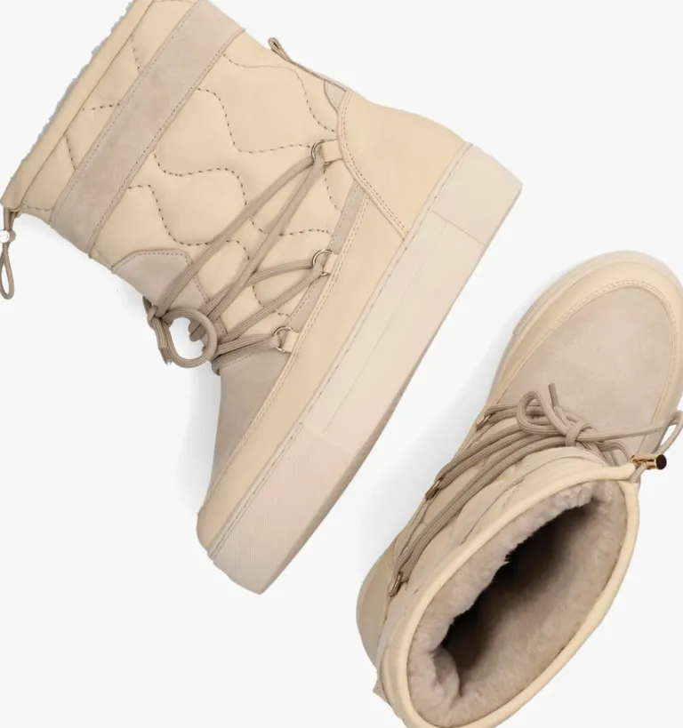Dit toffe model is een ware eyecatcher! Deze beige snowboot 74654 is van het vooruitstrevende merk RED-REG en heeft een bovenwerk van leer met panelen van zacht suède. De boot heeft een een doorgestikte schacht met een golvend profiel en een hoogte van 19 centimeter met een verstevigende hielcap van leer en een suède aantreklus. De vetersluiting over de wreef geeft hem een extra stoere touch en met het trekkoordje boven aan de schacht draag je hem gemakkelijk iets strakker of losser, maar net wat jij fijn vind. Het binnenwerk is gevoerd met heerlijk, warm en zacht wol in combinatie met een uitneembaar voetbed van leer, zodat je ook tijdens koude winterdagen lekkere warme voeten behoudt. De rubberen plateauzool met reliëf rondom de neus en hiel is 3,5 centimeter hoog, waardoor hij zorgt voor wat extra lengte.Het golvende profiel geeft een goede grip en stabiliteit. Combineer ‘m bij je favoriete outfit en steel de show!