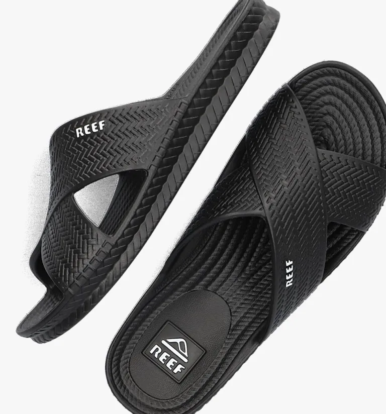 Uit de collectie van het merk Reef is deze onweerstaanbaar comfortabele slipper WATER X SLIDEDit zwarte model heeft twee, gekruisde wreefbanden van rubber met een vissengraat patroon. Het voetbed van rubber heeft een anatomische ondersteuning voor optimaal comfort en demping. De gripvaste, rubberen zool met gevlochten patroon loopt naar achteren op naar zo’n 2,5 centimeter dik. De idealeslipper voor ieder avontuur!