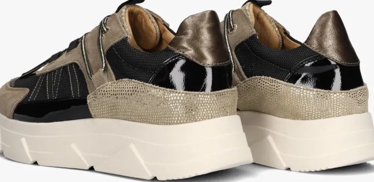 Stap stijlvol de deur uit met de KADY FAT 429 lage sneakers van TANGO. Deze zwarte met taupe kleurige sneakers hebben een overlays van leer, suède en textiel met goudkleurige details. De ronde neus, glitter en goudkleurige panelen en ronde vetersluiting zijn perfect voor een dagje shoppen of een ontspannen wandeling in het park. De leren binnenkant zorgt voor ultiem comfort, terwijl de stevige witte rubberen zool je de hele dag door ondersteunt. Combineer deze veelzijdige sneakers met een strakke jeans en een casual blouse voor een moeiteloze, trendy look. Of draag ze onder een zomerse jurk voor een speelse twist. Met de KADY FAT 429 ben je altijd klaar voor elke gelegenheid.