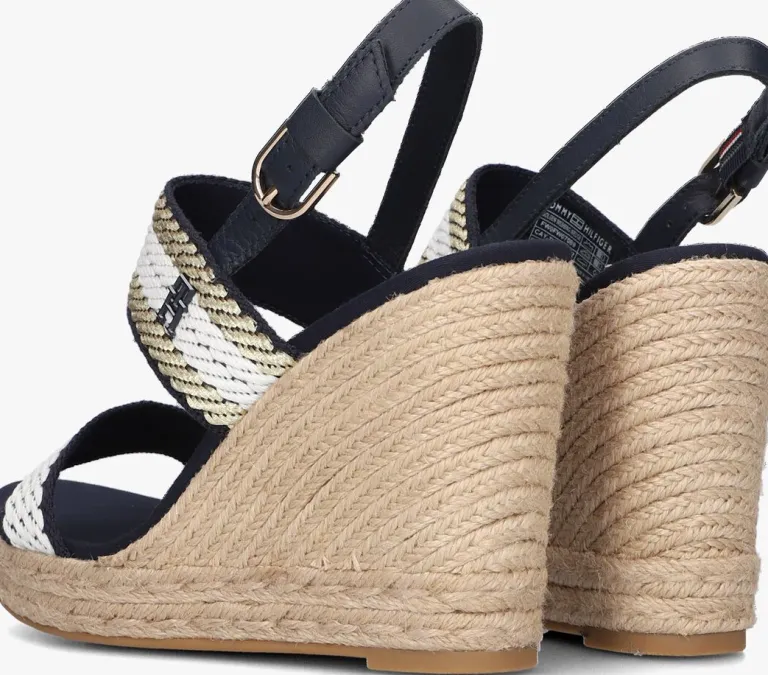 Uit de collectie van het Amerikaanse merk TOMMY HILFIGER isdeze toffe donkerblauwe sandaalGOLDEN WEBBING met sleehak. Je benen lijken er super lang door en ze lopen ook nog eens erg comfortabel! Met het donkerblauwe enkelbandje met handige gespsluiting maak je ‘m eenvoudig passend naar jouw voet. De sandaal is uitgevoerd in donkerblauw textiel met twee banden over de voorvoet en wreef. Deze banden zijn afgewerkt met wit en goudkleurig textiel. De sleehak is afgewerkt met gevlochten jute en past perfect bij de rest van de sandaal! Het licht opgevulde, canvas voetbed is voorzien van een leren inzet met merkopdruk onder de hiel. Hetplateau is 2,5 centimeter dik onder de voorvoet zorgt ervoor dat jeer lange zwoele zomeravonden comfortabel mee door kunt komen. De sleehak heeft een hakhoogte van 11centimeter en dankzij de rubberen loopzool ervaar je veel grip en stabiliteit. Combineer ‘m onder jouw favoriete zomerse outfit voor een mooie elegante look met vrouwelijke uitstraling!