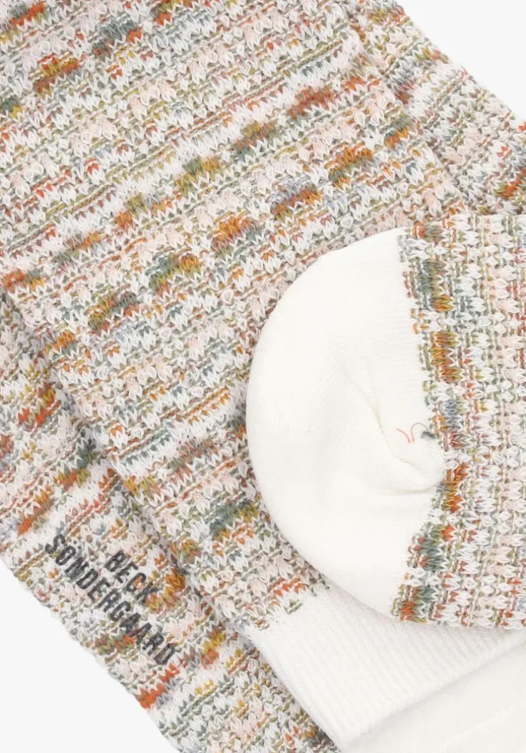 In 2003 startten AnnaSøndergaardandLis Beck hun Deense merkBecksondergaard. Een speelse collectie van vindingrijke accessoires met een persoonlijketouchdie seizoen na seizoen gedragen kunnen worden. Het merk staat bekend om zijn kleurrijke producten met mooie contrasten en unieke prints. Deze lange sokken ATHENA LONG SOCK maken je outfit helemaal compleet en zorgen voor een vrolijke touch. De sokken zijn gemaakt van kleurrijk textiel met een grof gebreide streepjesprint in een oranje, groene en witte kleur. Samenstelling van de sokken: 40% katoen, 37% polyester, 20% nylon en 3% elastaan.