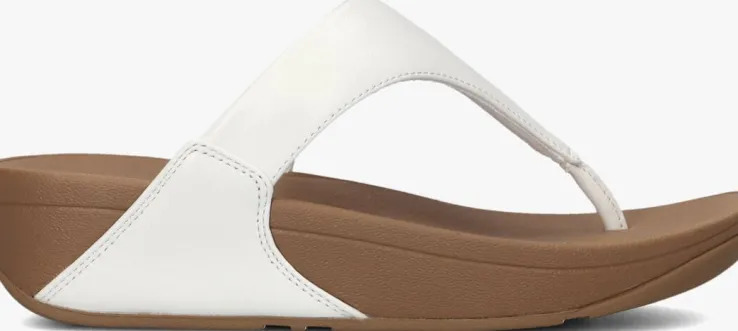 Witte teenslipper voor dames van het merk FitFlop. Deze teenslipper is uitgevoerd met een brede, lederen band. Deze band loopt door tot onderaan de loopzool. De binnenvoering is van leer, het voetbed is van rubber. Verder heeft de rubberen loopzool een fijn profiel en bedraagt de hakhoogte circa 4,5 cm.