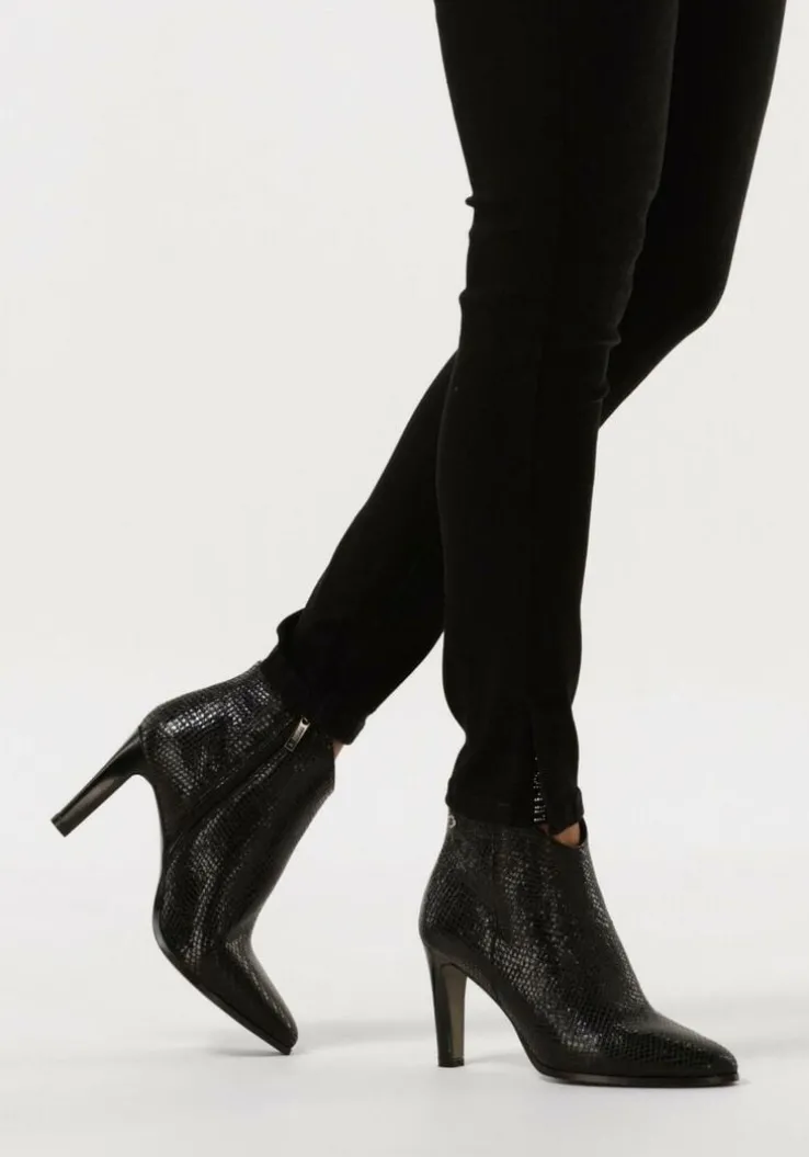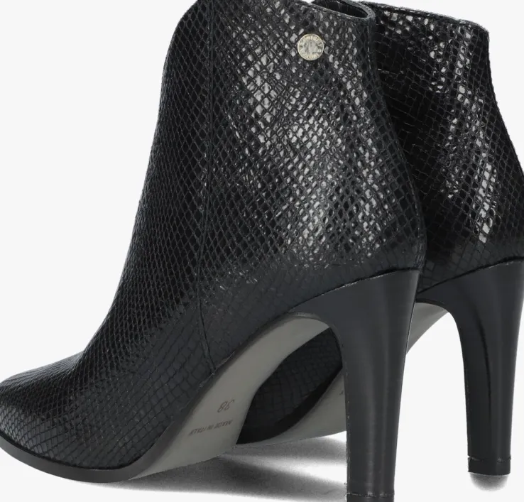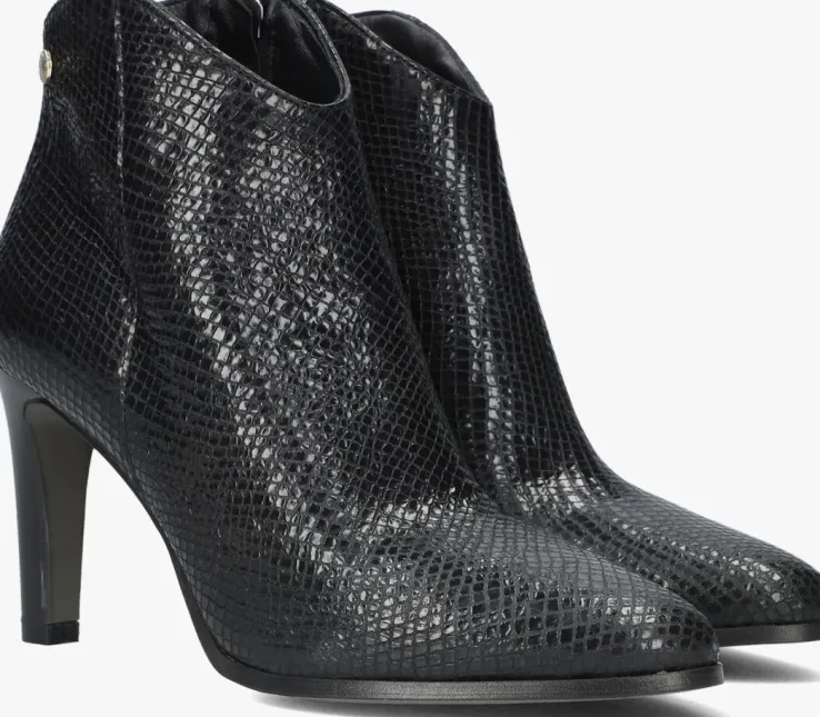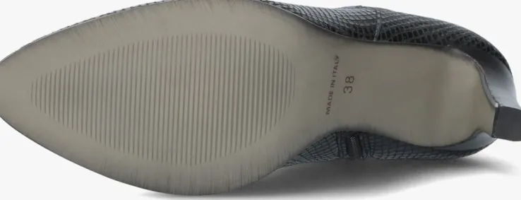 De elegante, Italiaanse ontwerpen van het merk NOTRE-V zijn er voor de verfijnde vrouw die er graag effortless chic uitziet. De producten zijn gemaakt van luxe materialen met subtiele accenten en een knipoog naar de laatste trends.Dit zwarte enkellaarsje 7433heeft een eleganteuitstraling door de slanke vormgeving en is voorzien van een afgeronde schachten een smalle hak. Het laarsje is uitgevoerd in leer met een glanzende reptielenprint en een handigerits aan de binnenkant. Het binnenwerk van zacht en soepel leer voelt comfortabel aan en heeft een vast voetbed. De hak is ruim 9centimeter hoog en de schacht heeft een hoogte van zo’n 10centimeter, gemeten bij maat 37.