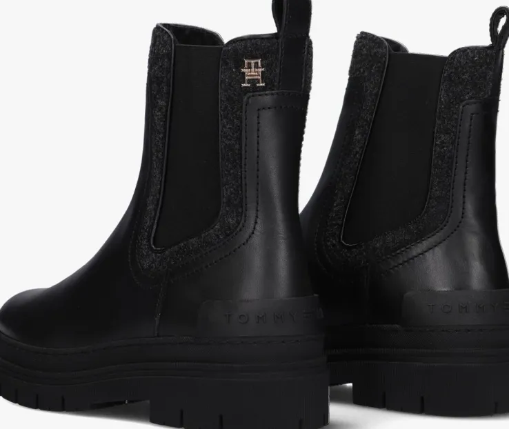 Stap stijlvol de dag door met de FEMININI FELT CHELSEA BOOTIE van TOMMY HILFIGER. Deze zwarte leren chelsea boots met chunky zool zijn perfect voor dames die op zoek zijn naar comfort en fashion. De elastische inzetten zorgen voor een trendy look en een gemakkelijke instap in combinatie met de aantreklus. Ook heeft dit model randen van textiel en een metaal logo aan de zijkant. De textiel voering zorgt voor extra comfort tijdens het dragen. Combineer deze must-have schoenen met een skinny jeans en een oversized trui voor een casual-chique look. Of draag ze onder een jurkje voor een edgy twist. Laat je creativiteit de vrije loop en rock deze boots op jouw eigen manier!