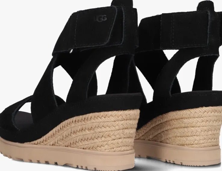 Sandaal met sleehak voor dames van het merk UGG. Deze sandaal met open neus is uitgevoerd in zwart suède. Over de voorvoet loopt een brede band. Een bandje rondom de enkel en een stevig hielpad dragen bij aan het loopcomfort. De sleehak met raffia meet circa 4 cm en de rubberen zool heeft een medium profiel voor stevige grip.
