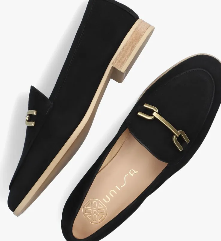 Een traditionele loafer met trendy accenten, dat is deze zwarte loafer DALCYvan het Spaanse merk UNISA. Het bovenwerk is van zacht suèdeen heeft een decoratieve goudkleurige schakel op de wreef. De binnenvoering isvan textiel voor een lichter en frisser gevoel en het vastevoetbed vanantislip leer zorgt voor een stabiel gevoel. Dankzij de zool van glad, maar gripvast rubber en het hakje met een hakhoogte van 1,5 centimeter loopt deze slanke loafer heerlijk comfortabel.Draag ‘m bij een basic outfit en laat jouw loafers de show stelen!
